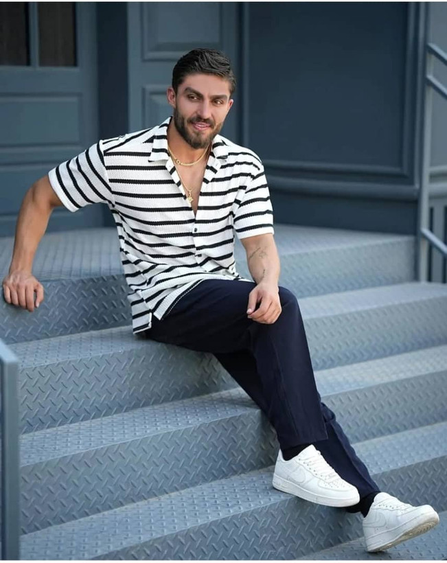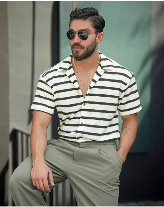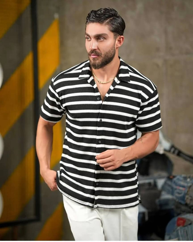 پیراهن مردانه راه راه آستین کوتاه پارچه گردباف با کیفیت و خنک
